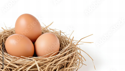 Fresh Brown Chicken Eggs in a Straw Nest On white background