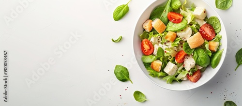 Fresh Caesar salad in a bowl displayed on a white background perfect for a healthy and tasty meal The banner features ample copy space for additional content