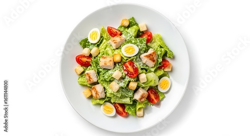 Fresh caesar salad with shrimp and quail eggs on a white plate