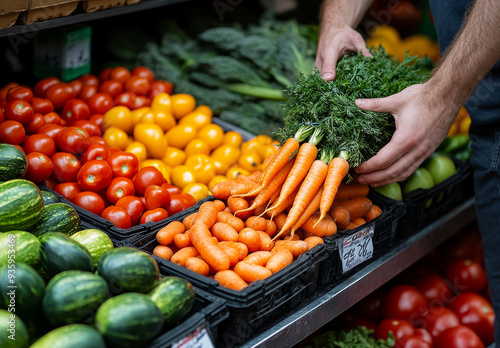 Fresh carrots being selected among colorful vegetables at market. A hand picks fresh carrots from a vibrant display of vegetables at a local market filled with tomatoes and cucumbers.