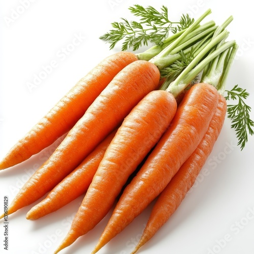 Fresh carrots with vibrant orange color and verdant tops are bundled and lying on a white surface