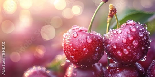 Fresh cherry adorned with glistening dewdrops on its surface, showcasing the beauty of cherry and the refreshing presence of cool dew water in nature. Perfectly captures the essence of cherry.