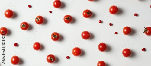 Fresh Cherry Tomatoes and Peppercorns on White Background with Copy Space
