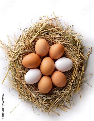 fresh chicken eggs in a haystack isolated on white background