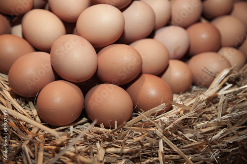 Fresh chicken eggs in hen house