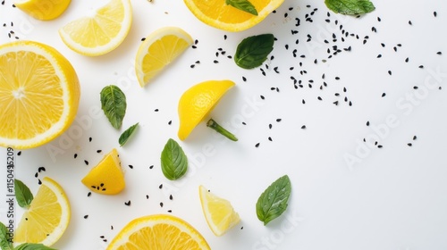 Fresh citrus fruits, lemon and orange slices, scattered with black sesame seeds and fresh basil leaves on a white background.