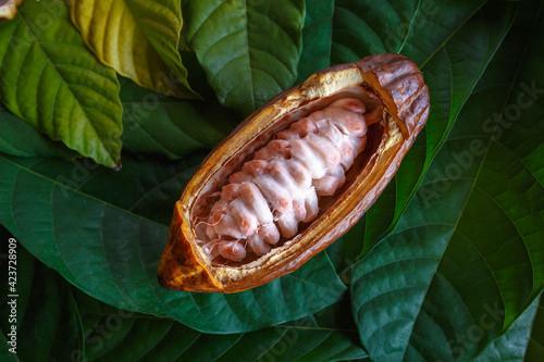 .Fresh cocoa pods and fresh cocoa beans on cocoa leaf background.