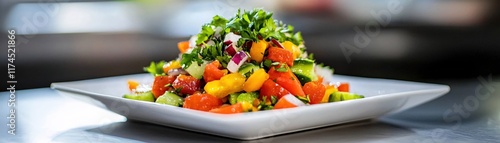 Fresh Colorful Salad with Vegetables and Herbs Presented on a Square White Plate in Restaurant
