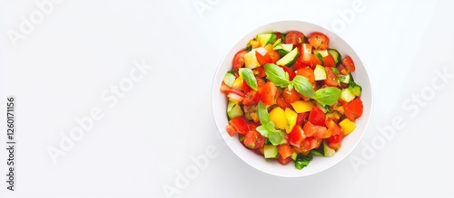 Fresh colorful vegetable salad in a white bowl viewed from above with vibrant tomatoes, cucumbers, and greens on a clean white background
