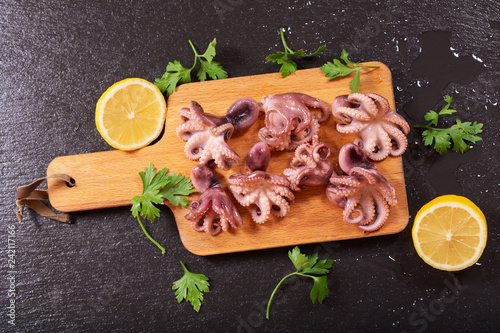 fresh cooked octopus with parsley and lemon, top view