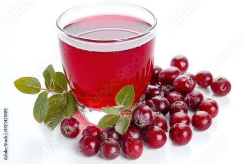 Fresh cranberry juice displayed in a glass with ripe cranberries and leaves on a white background