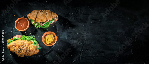 Fresh croissants sandwiches with lettuce, fried egg and prosciutto on dark background. Delicious and healthy breakfast