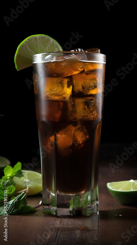 Fresh Cuba Libre cocktail. Made with brown rum, cola, mint and lime. Generative AI.