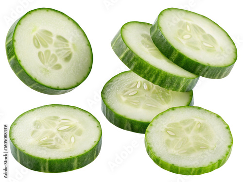Fresh cucumber slices isolated on a clean background showcasing texture and vibrant green color