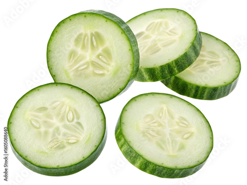 Fresh cucumber slices isolated on white background showcasing crisp texture and vivid green skin