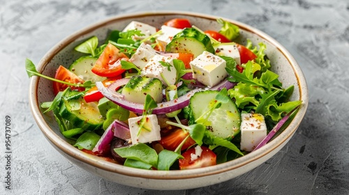 Fresh cucumber, tomato, and feta cheese salad with onion and greens on grey background