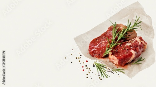 Fresh Cut: A close-up studio shot showcases a pair of raw, marbled steak cuts on a parchment, complemented by fresh rosemary sprigs and a scattering of peppercorns.
