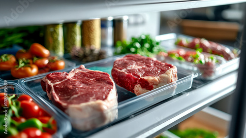 Fresh cuts of meat are prominently displayed in a refrigerator, surrounded by various vegetables and condiments, showcasing a well-stocked kitchen environment.
