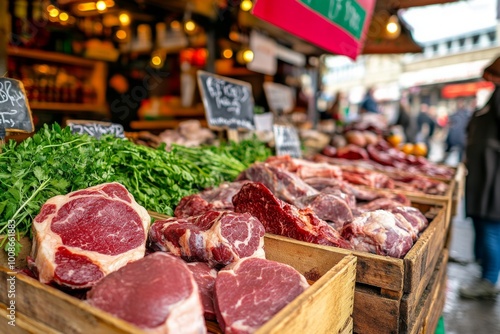Fresh cuts of meat displayed on wooden crates at a local market. Bright greens complement the rich colors of the meat. A lively atmosphere captures the essence of shopping. Generative AI