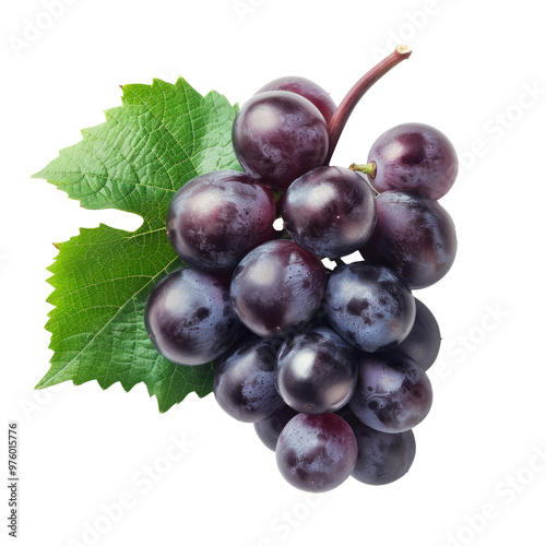 Fresh dark purple grapes with green leaves arranged on a light background, showcasing their plump and juicy appearance for culinary use