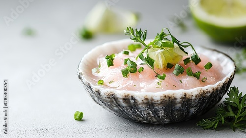 Fresh Fish Slices in Shell Dish, Lime Garnish, Grey Background