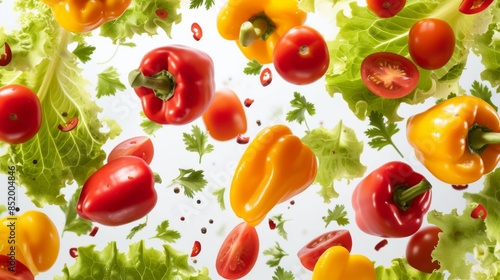 Fresh fruits and vegetables, including oranges, bell peppers, and leafy greens, appear to be floating in mid-air against a white background