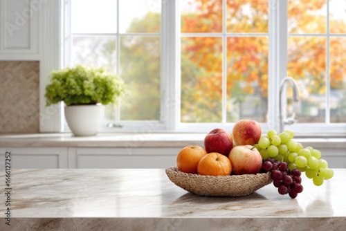 Fresh fruits in a woven basket on a marble kitchen countertop, with a bright window showcasing autumn foliage and a potted plant in the background, creating a warm atmosphere