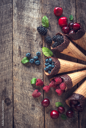 Fresh fruits in the ice cream cones on wooden background with blank space