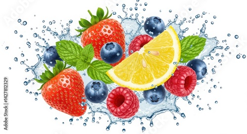 Fresh fruits with water splash on a white background view