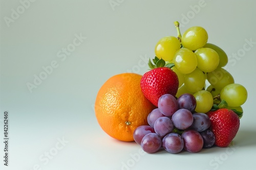 Fresh fruits, yellow oranges, red grapes, green grapes, purple grapes, juicy red strawberries. tropical fruits Arranged on a plain colored background. Green-white tone