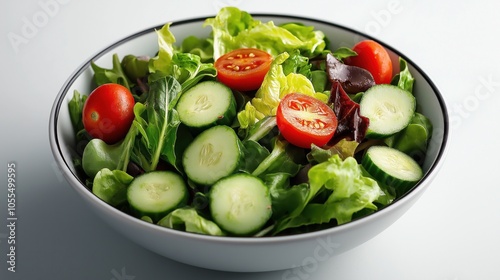 Fresh garden salad with mixed greens, cherry tomatoes, and sliced cucumber in a white bowl on a light background.
