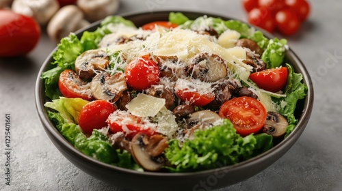 Fresh Garden Salad with Parmesan Cheese, Sliced Mushrooms, Cherry Tomatoes, and Crisp Romaine Lettuce in a Dark Bowl on a Gray Background