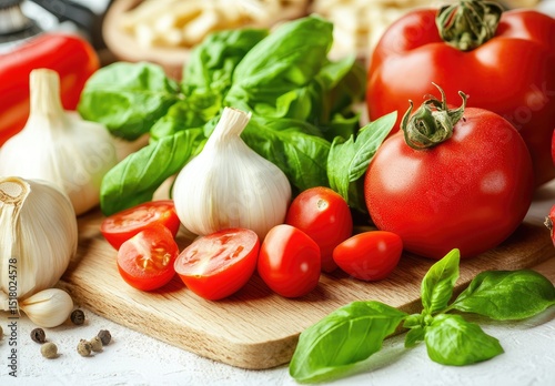 Fresh garlic, basil, and tomatoes on a wooden cutting board, ready for cooking, with additional ingredients in the background