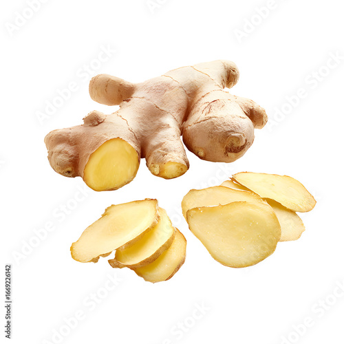 Fresh ginger root and sliced pieces isolated on a sleek black background display