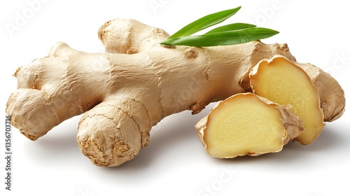 Fresh ginger root with slices and leaves isolated on white background.