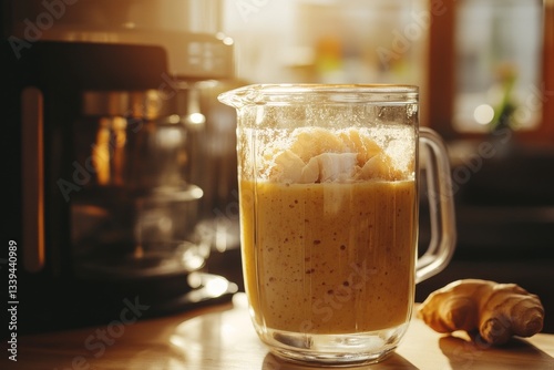 Fresh Ginger Smoothie in Blender with Morning Light Reflection