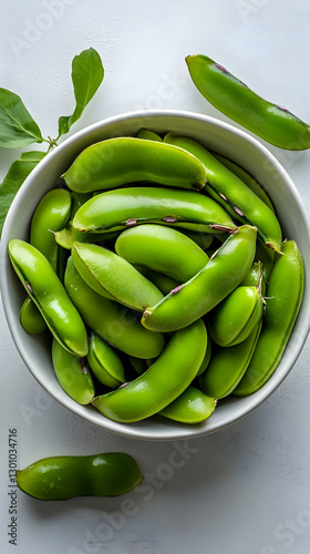 Fresh green edamame in a bowl symbolizing health and vitality on a bright background