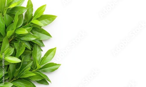 Fresh green foliage border. Shiny leaves create a frame on the left against a blank white backdrop, offering ample space for text or design elements. Natural simplicity is emphasized