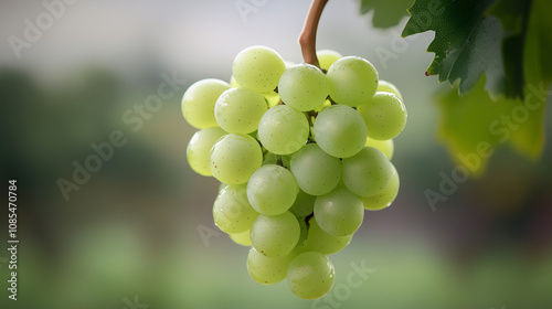 Fresh green grapes hanging from vine, showcasing their plump and juicy appearance. vibrant color and natural setting evoke sense of freshness and health.