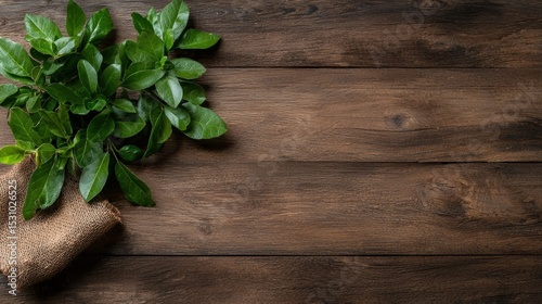 Fresh Green Leaves Arrangement on a Rustic Wooden Table with Space for Your Text Ideas and Concepts