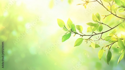Fresh green leaves budding on a branch in warm spring sunlight with soft bokeh