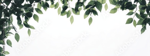 Fresh green leaves frame a white background. Delicate foliage forms a border against a clean backdrop, suggesting nature's beauty and tranquility