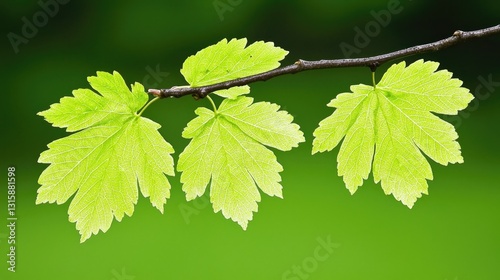 Fresh Green Leaves on a Branch with Dew Drops Glimmering Under Soft Natural Light in a Lush Green Background