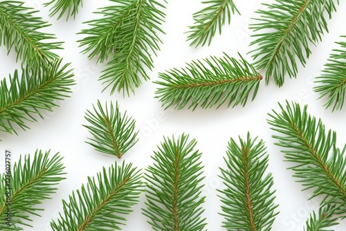 Fresh green pine branches arranged on a white background creating a natural and vibrant pattern for seasonal decor
