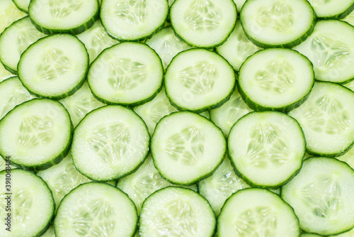 Fresh green slices of cucumber as background.