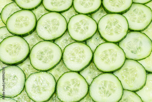 Fresh green slices of cucumber as background.