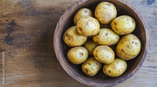 Fresh harvested potatoes in a wooden bowl on rustic wooden table with copy space for text. Organic vegetables concept.