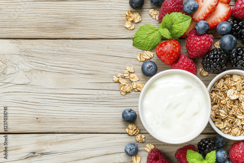 Fresh healthy breakfast with yogurt, granola, and mixed berries. Enjoy nutritious start to your day