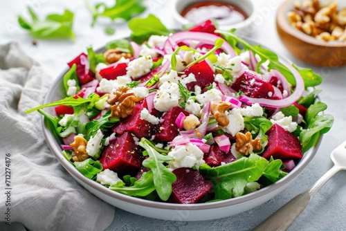Fresh healthy salad with beets feta pear arugula lamb lettuce red onion chard walnut on a white kitchen table