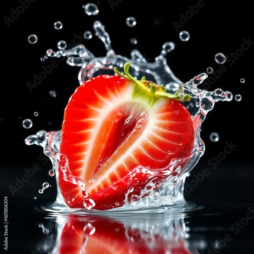 Fresh, highly detailed strawberry slices are hitting the water's surface with a dramatic splash, creating a fresh and dynamic visual effect.